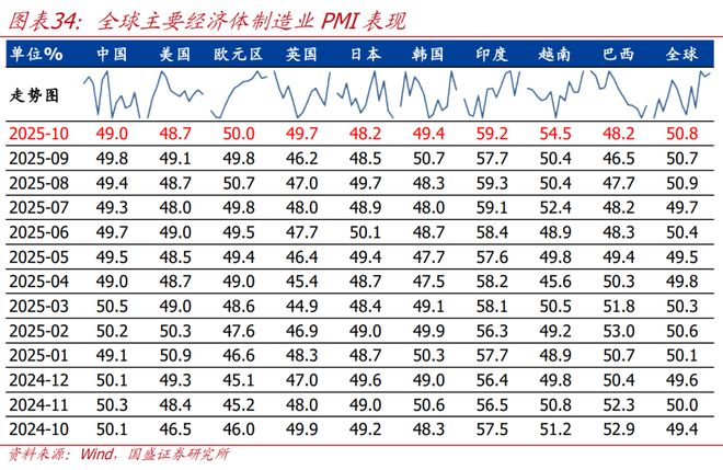 回顾2025年,全球经济温和修复,但区域分化明显。年初以来,全球制造业PMI围绕荣枯线上下波动,整体表现略好于2024年底。分国别来看,发达经济体PMI大多处在荣枯线以下,其中欧洲PMI持续回升至荣枯线以上,表现最佳;新兴经济体中,印度、越南等东南亚国家表现较好,巴西表现较差。