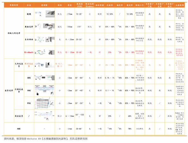 在光学显示领域,天风证券的报告指出,当前市场主流的AR眼镜多采用Birdbath方案。该方案因其成本较低、工艺成熟且能配合OLED屏幕实现出色的显示效果而被广泛应用。但其缺陷也同样显著,包括约25%的低透光率、模组较厚、视野受限以及漏光等问题,使其难以实现接近普通眼镜的日常佩戴形态。