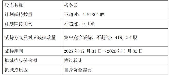 截至2025年12月8日,杨冬云共持有2152.7361万股香飘飘股票,占公司总股本的5.21%,此次拟减持不超过41.9864万股,减持时间是2025年12月31日-2026年3月30日,这也是其首次减持股票。
