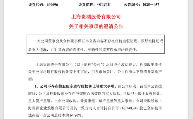 经公司核实,截至本公告披露日,公司及控股股东不存在应披露而未披露的重大信息,包括但不限于股权转让、重大资产重组、上市公司收购、业务重组、破产重整等重大事项。公司控股股东上海贵酒企业发展有限公司及其一致行动人合计持有公司2.17亿股已全部被司法冻结,占公司总股本的64.80%。