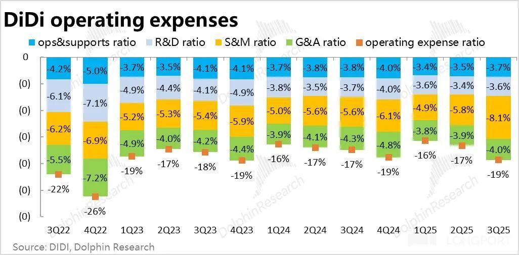 从成本和费用角度看利润率下滑的原因,滴滴本季的毛利率为 19.1%,环比由 0.5pct 的下滑。由于本季国内业务平台销售额/GTV 的比重相比上季持平,因此应当主要是受海外业务营收比重走高,同时因投入增加海外业务毛利率也有所下滑的双重影响。