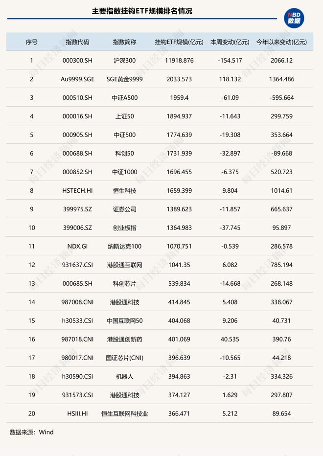 从挂钩指数来看,头部指数挂钩ETF规模分化也较大,沪深300、中证A500和创业板指等宽基指数全线缩水,而港股通创新药和港股科技相关指数规模持续反弹。