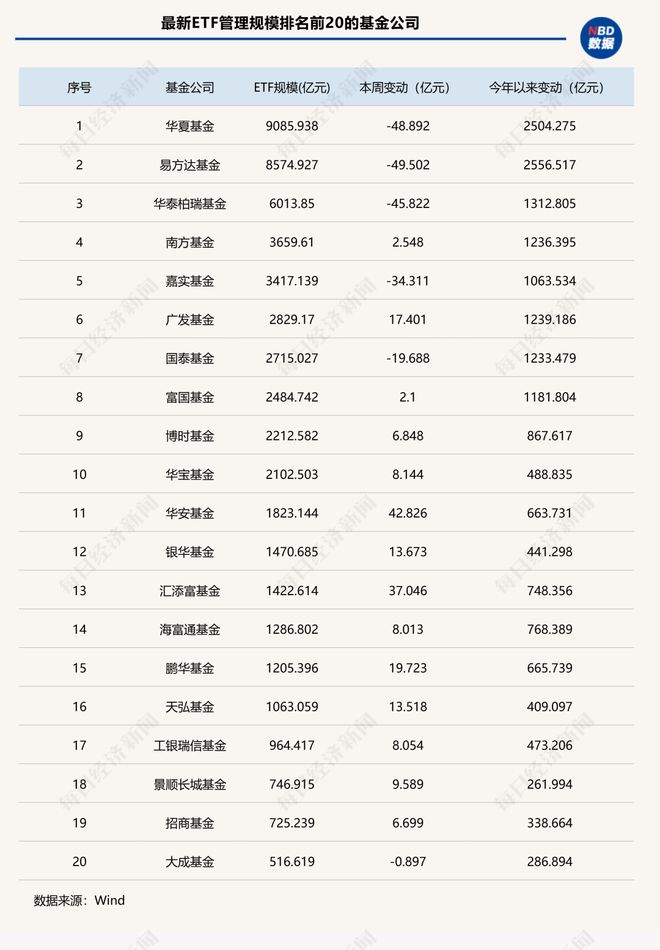 另一方面,华安基金、汇添富基金和鹏华基金本周ETF规模增长靠前,分别增加42.83亿元、37.05亿元和19.72亿元。