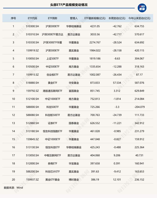 其中,有多达6只ETF规模缩水超20亿元。华泰柏瑞和易方达基金旗下沪深300ETF单周均减少超42亿元,华夏基金和嘉实基金旗下沪深300ETF同步减少超28亿元。此外,易方达基金旗下创业板ETF和科创板50ETF本周分别缩水26.43亿元和24.74亿元。