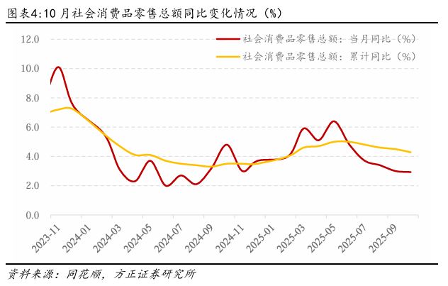 社零总量保持稳定,服务消费增长加快。2025年10月份,社会消费品零售总额46291亿元,同比增长2.9%,增速较9月放缓0.1个百分点,累计增速则为4.3%,较1-9月微降0.2%,核心受占比较大的汽车销售走弱影响。10月除汽车以外的消费品零售额42036亿元,同比增4.0%,增速较上月提升0.8%。