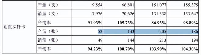报告期内,公司2D MEMS探针卡、垂直探针卡产能合计为245.68万支、497.02万支、1,048.53万支和727.90万支,产能利用率分别为100.89%、101.13%、94.50%和85.34%。报告期内,公司悬臂探针卡产能分别为128.10万支、141.89万支、119.17万支和73.15万支,产能利用率分别为105.79%、84.50%、107.13%和98.21%,均存在一定波动。