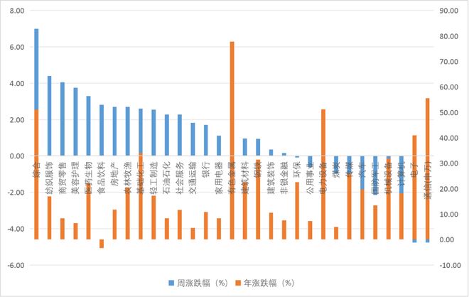 分行业来看,本周综合、纺织服饰、商贸零售、美容护理、医药生物等行业领涨,通信、电子、计算机等行业领跌,可以看到,领涨的行业年内涨幅相对落后,而领跌的行业的年对涨幅靠前,高低切明显,而实际上这一风格切换从10月份就已经开始了。