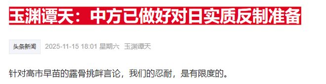 11月15日,玉渊谭天发文“中方已做好对日实质反制准备”。文中表示,针对高市早苗的露骨挑衅言论,我们的忍耐,是有限度的。如果日方执迷不悟,中国就没有什么好再克制的了。