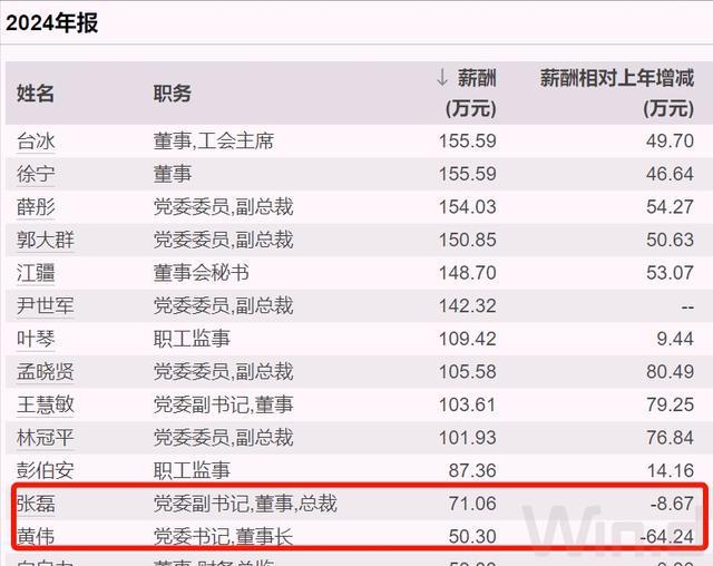 至于公司高层,去年税前薪酬最高是工会主席兼董事台冰(这个“台”姓真少见啊),超过155万元;而黄伟和张磊薪酬分别是50万元、71万元,在高层中就比较靠后了。
