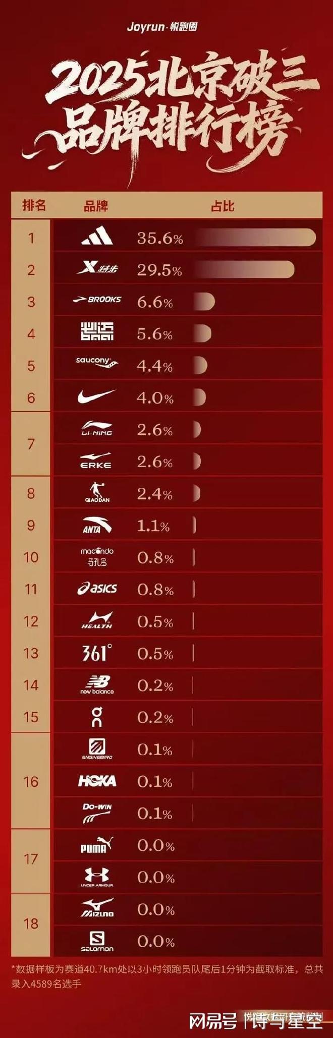 由于北马主赞助商是阿迪达斯,所以阿迪达斯和大量的破三选手签约了免费试用协议(成绩达到标准即可免费送),阿迪达斯成为占比最高的品牌。