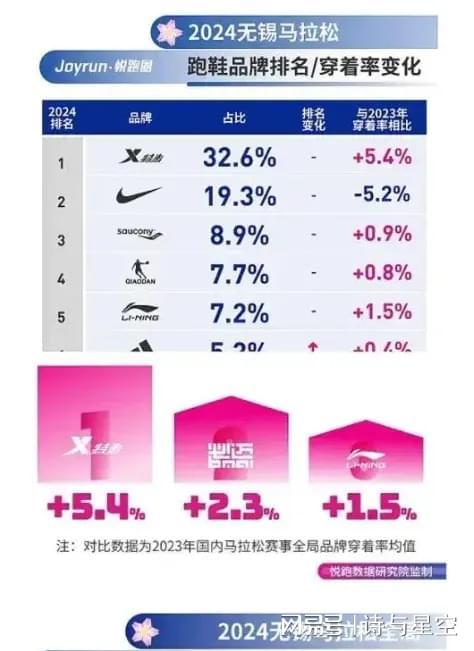 比如何杰破国家记录的无锡马拉松,特步占比接近三分之一,加上索康尼占比超40%。