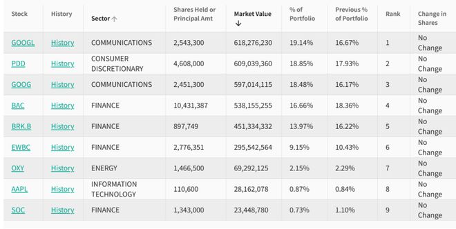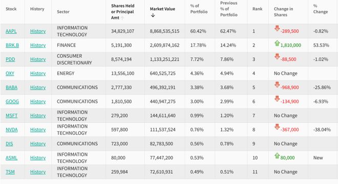 他还增持了巴菲特旗下的伯克希尔,期末持股市值增至26亿美元,占总持仓的比例也升至14.24%,稳居第二大重仓股。