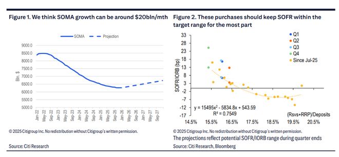 具体操作上,这意味着美联储将对所有到期的国债进行再投资,并在此基础上额外购买约200亿美元国债,用以抵消抵押贷款支持证券(MBS)到期造成的资产减少。花旗认为,这一购买规模足以在明年正常交易日将SOFR(以及担保国债回购利率TGCR)控制在目标区间内。