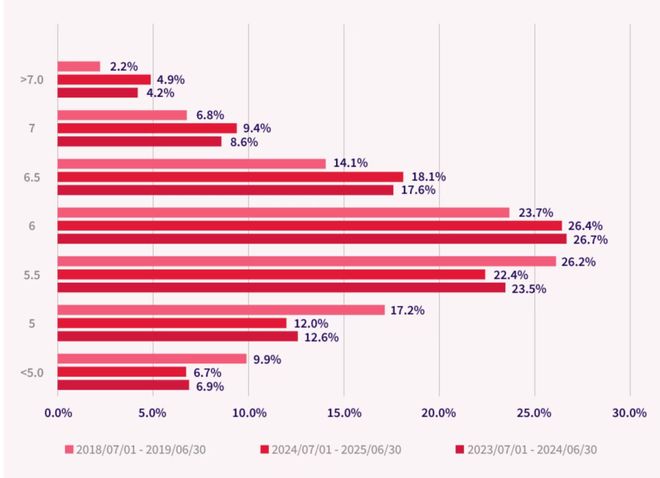 图源:2024-2025中国大陆地区雅思考生成绩大数据报告