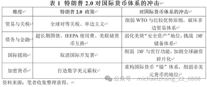 当前,特朗普2.0通过债务工具制度化、多边主义退潮及数字货币重构战略,发起对战后国际货币体系的系统性挑战,这可能引发新一轮全球金融体系的重构。在全球经济秩序尚未从多边主义向多极分化完成过渡的历史节点上,正对国际货币体系构成深刻冲击(见表1)。
