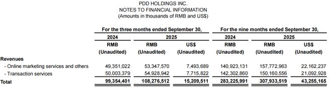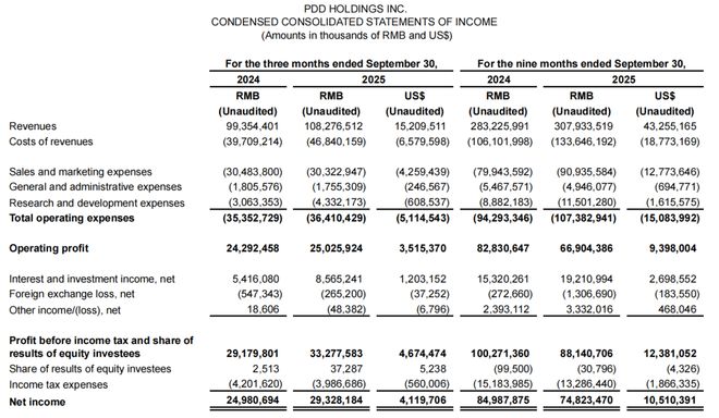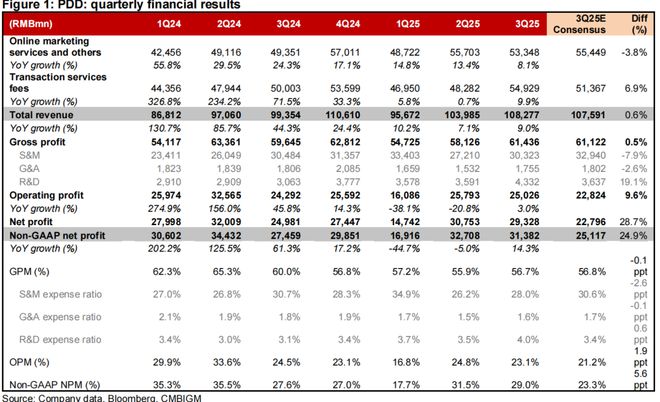 2025年第三季度,拼多多总营收为1082.765亿元,同比增长9%,这一数据略高于市场预期,但延续了自2024年以来的增长减速趋势,增速较去年同期的24.3%显著放缓。