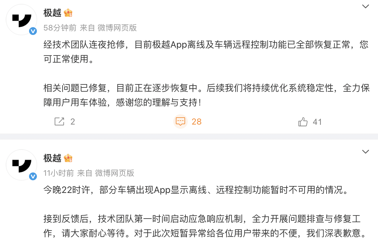 24日上午9时左右,极越汽车方面再次回应称,经技术团队连夜抢修,目前极越App离线及车辆远程控制功能已全部恢复正常,可正常使用。“相关问题已修复,后续我们将持续优化系统稳定性,全力保障用户用车体验。”