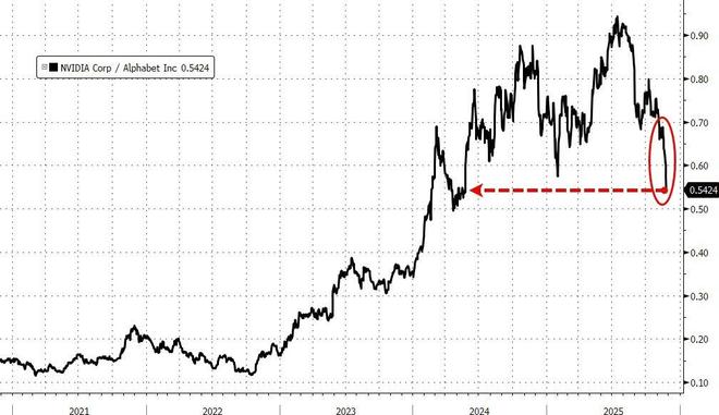 本周二早盘,英伟达股价一度重挫逾7%,市值蒸发近3500亿美元,后跌幅收窄,收跌2.6%,收创两个多月新低,而谷歌母公司Alphabet股价则进一步走高,早盘曾涨超3%,尽管此后回吐部分涨幅,仍收涨1.6%,连续第三个交易日刷新历史新高。