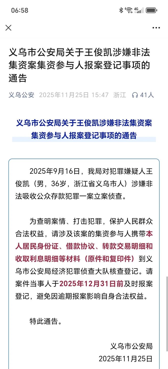 通告称,“2025年9月16日,我局对犯罪嫌疑人王俊凯(男,36岁,浙江省义乌市人)涉嫌非法吸收公众存款犯罪一案立案侦查。为查明案情、打击犯罪,保护人民群众合法权益,请涉及该案的集资参与人携带本人居民身份证、借款协议、转款交易明细和收取利息明细等材料(原件和复印件)到义乌市公安局经济犯罪侦查大队核查登记。请案件当事人于2025年12月31日前及时报案登记,避免因逾期报案影响自身合法权益。”