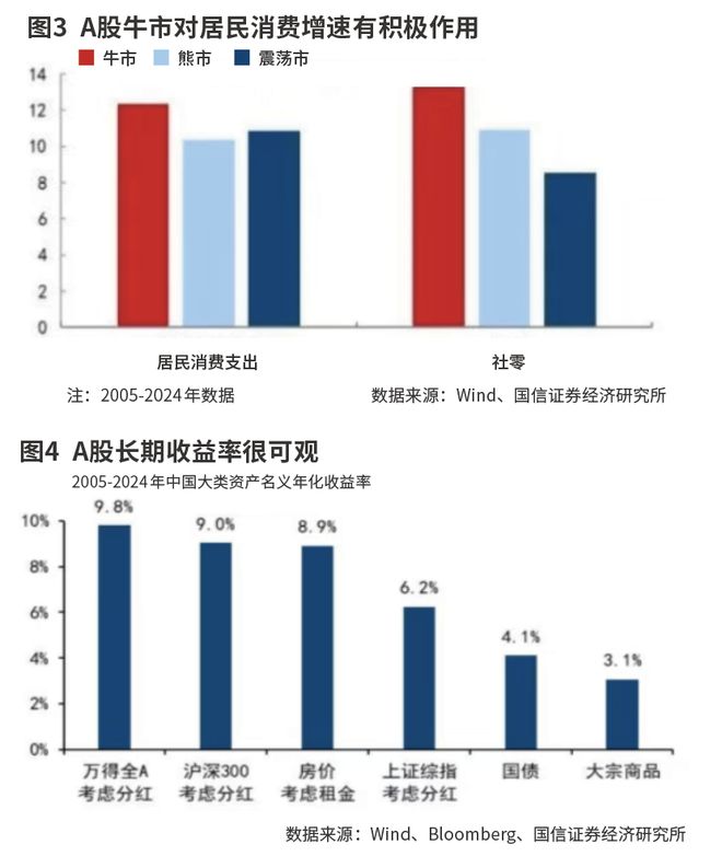 国信证券认为,中国股市的上涨也利于消费。根据2005-2024年A股的年度走势对市场状态进行划分,单边上涨、单边下跌和区间震荡分别对应牛市、熊市和震荡市,可以发现牛市年度中,居民消费支出、社会消费品零售总额同比增速均值分别为12.3%、13.3%,高于熊市年度的10.3%、10.9%。