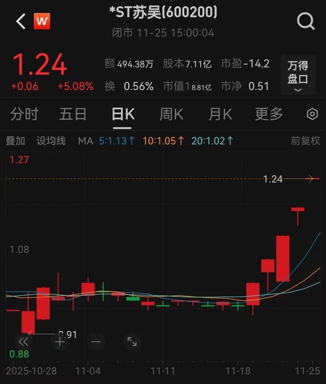 值得一提的是,公告停牌前,*ST苏吴达成“五连板”。截至发稿,公司股价报1.24元,涨幅为5.08%,市值约为8.81亿元。