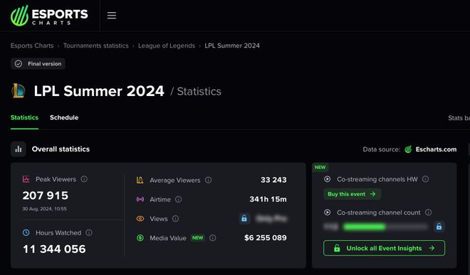 进入2024年后,LPL热度稍有回暖,但很快又呈现出颓势。据EsportChatrs官网数据显示,2023年LPL春季赛的观看人数峰值为20万人,夏季赛的观看人数峰值增长到28.8万人。在此基础上,2024年LPL春季赛的观看人数峰值达到了29万人,但这一数据在随后的夏季赛跌到20.8万人,几乎回到了2023年的低谷。