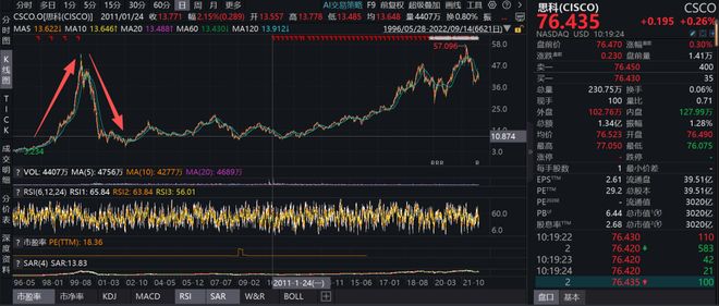 金石杂谈查询发现,1999年的思科大约十年间涨了几百倍,但是在2000年至2002年两年间股价暴跌了90%。但是还有一点,目前思科基本回到了当年的位置,但却耗时10多年才到达。
