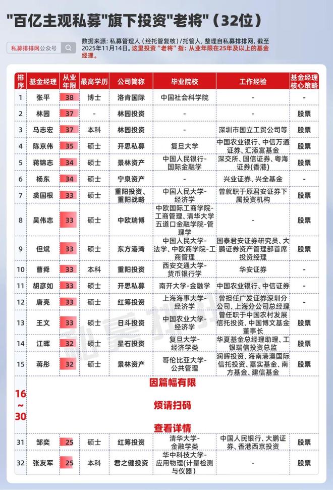 32位百亿主观私募旗下投资“老将”!来自复旦、人大等知名院校!