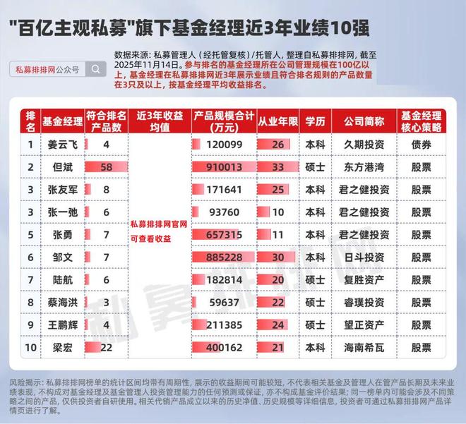 业绩方面,截至11月14日,百亿主观私募旗下在私募排排网上有近3年业绩展示的基金经理共有40位,旗下符合排名的产品合计171只,产品规模合计约为487.08亿元。