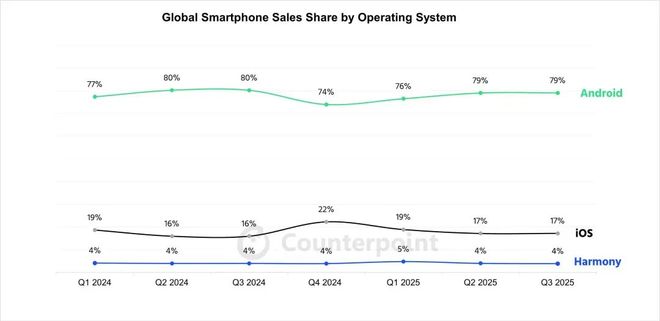 华为鸿蒙系统于2019年8月正式发布。2021年6月,华为正式推出鸿蒙系统2.0,并发布首批搭载鸿蒙系统的手机及其他全场景新品。市场研究机构CounterPoint Research 最新数据显示,2025年第三季度,全球智能手机操作系统Android占据79%,iOS为17%,HarmonyOS达到4%,这一格局与第二季度基本一致。