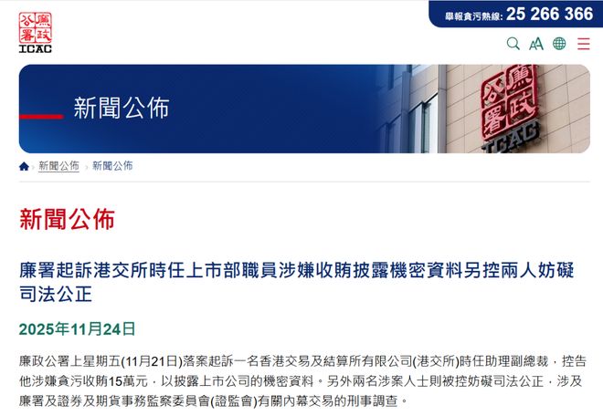 香港廉政公署,于上星期五(11月21日)落案起诉一名香港交易及结算所有限公司(港交所)时任助理副总裁,控告他涉嫌贪污收贿15万港元,以披露上市公司的机密资料。另外两名涉案人士则被控妨碍司法公正,涉及廉署及证券及期货事务监察委员会(证监会)有关内幕交易的刑事调查。