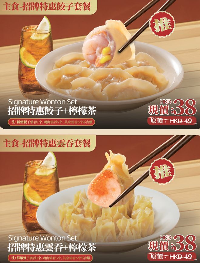 香港消费者口味偏清淡、偏甜、对辣度接受较低。比如,韭菜鸡蛋饺子、鲜虾蟹子云吞、鲜肉云吞是本土消费者较为青睐的“爆款”。在当地的饮食习惯中,饮也非常重要,因此门店都会加上冻奶茶、冻柠茶等内地没有的饮品。