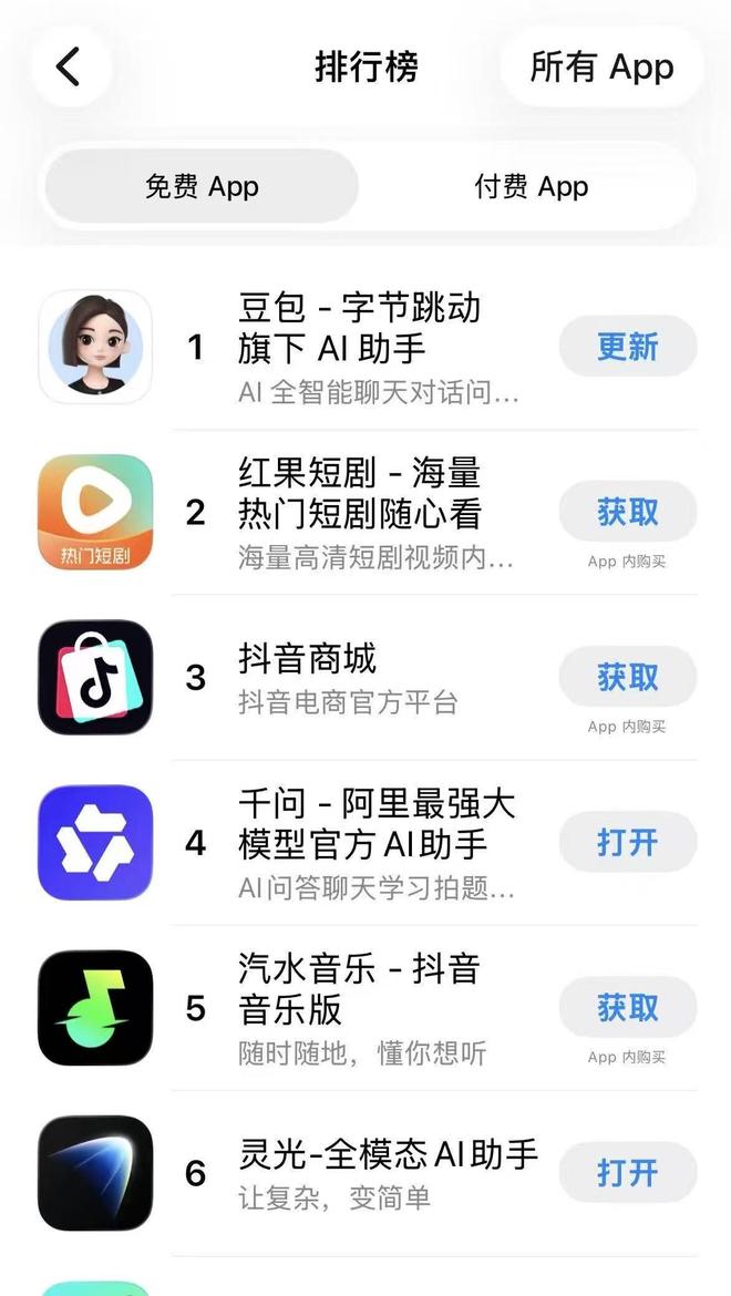 而随着灵光的爆火,至此阿里系双AI应用(千问+灵光)已占据APP Store免费榜总榜Top6两席,终结字节系产品长期包揽榜单的局面。