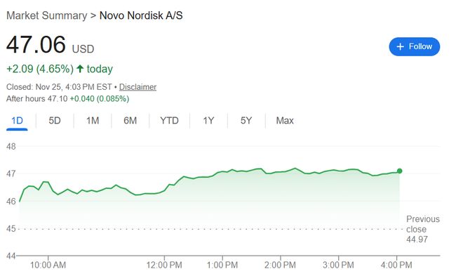 消息推动诺和诺德的美股股价收涨超4.6%,收复昨日Ozempic药物实验失败带来的大部分跌幅。
