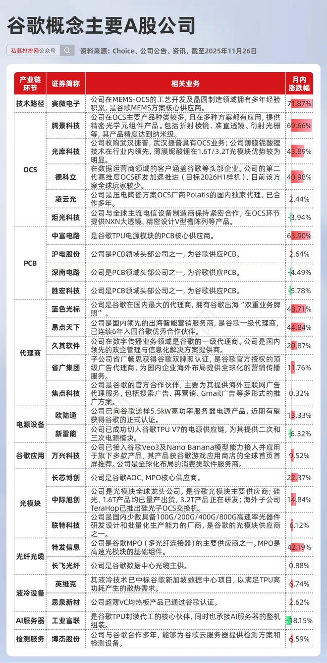 华鑫证券认为,谷歌以全栈式软硬件基础设施解决方案构筑了其他公司难以复制的AI生态护城河。谷歌AI生态的繁荣,直接提振了其软硬件产业链的需求,直接或间接向谷歌供应服务器、OCS、CPO、MPO、光纤、PCB、电源、液冷、AR等硬件产品,以及为谷歌提供广告服务的A股相关公司有望受益。