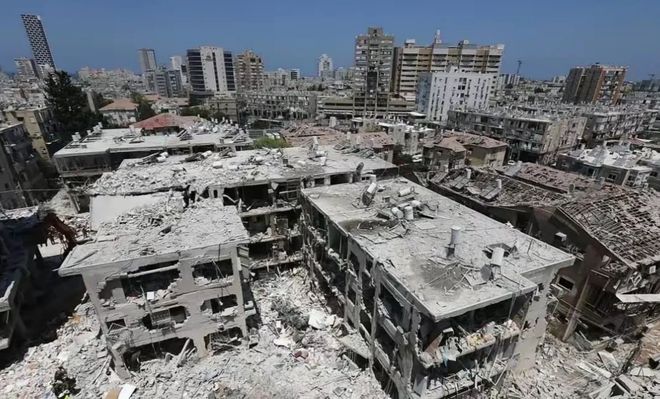 成年人上班提心吊胆,小孩上学还得戴着防毒面具,时刻准备着躲进防空洞,很多以色列人被吓得有家不能回,特拉维夫市区被炸毁的大楼,至今仍是一片狼藉。