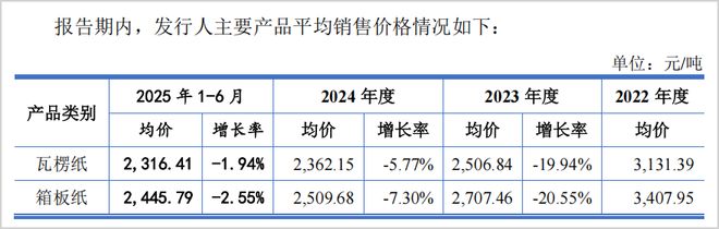 据招股书显示,自2022年以来其箱板纸销售单价持续下滑,从当年的3407.95元/吨下降到2025年上半年的2445.79元/吨,下降幅度达28.23%。
