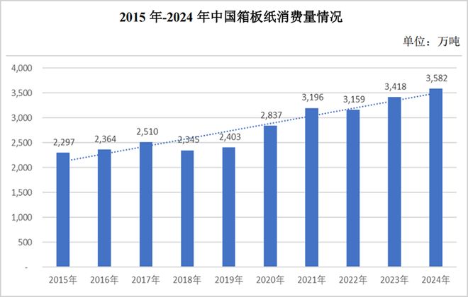 一方面,造纸业作为成熟行业,市场规模增长已经趋缓。以箱板纸为例,据中国造纸协会统计数据显示,2024年中国箱板纸消费量为3582万吨,同比增长了4.8%,2015-2024年的消费量年均复合增长率为5.06%。