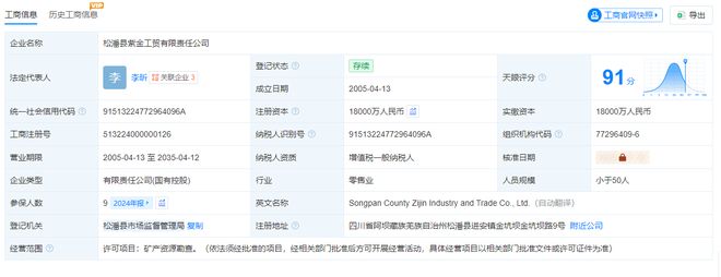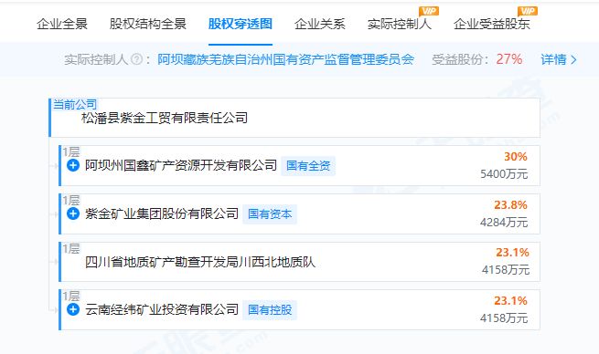据天眼查,松潘县紫金工贸有限责任公司成立于2005年,注册资本18000万人民币,分别由阿坝州国鑫矿产资源开发有限公司持股30%,紫金矿业集团股份有限公司持股23.8%,云南经纬矿业投资有限公司持股23.1%,四川省地质矿产勘查开发局川西北地质队持股23.1%。阿坝藏族羌族自治州国资委为实际控制人。