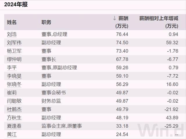根据年报披露,2024年薪酬最高的是原总经理刘浩,税前76万元。原董事长缪仲明大约68万元。