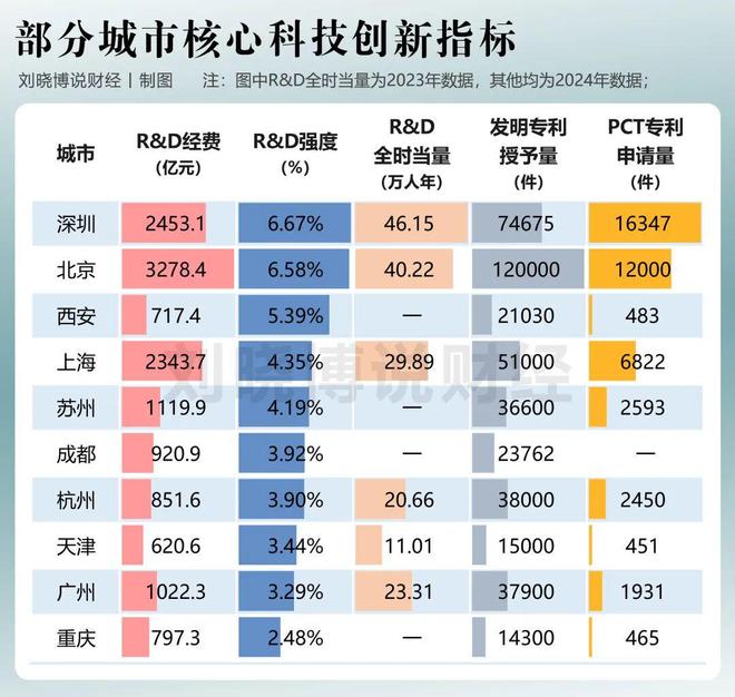 R&D经费投入额方面,深圳2024年为2453.07亿元,总量继续超过上海,仅次于北京位居全国第二。