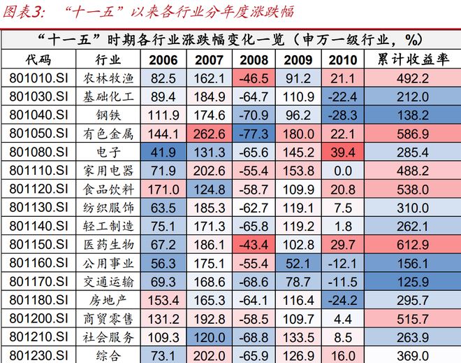 “十一五”时期波动剧烈(2006至2010年),经济发展和政策驱动是核心力量。股经历了一轮完整的牛熊转换,行情波澜壮阔,上证指数从2006年初的1161.06点一路飙升,在2007年10月16日创下6124.04点的历史顶,随后在全球金融危机的冲击下跌至2008年的1664.93点。为应对危机,国家在2008年底推出了大规模经济刺激计划,市场又在2009年出现大幅反弹,在这种背景下一些代表性公司走出亮丽表现。首先是,在加入WTO后,中国经济进入腾飞期间,城镇化、工业化快速推进,带动资源、地产、基建、银行等板块表现强势;其次是,次贷危机后大规模刺激计划着重扩内需,券商、地产、工程机械等板块显著收益。其三是,次贷危机后带来的全球宏观政策协同带动了商品超级周期,黄金、煤炭、有色等表现亮眼。其四是,在城镇化、工业化快速发展的背后,中国经济现代化进程也在快速发展,以白酒、家电为代表的消费股和医药、科技为代表成长股也迎来快速发展。