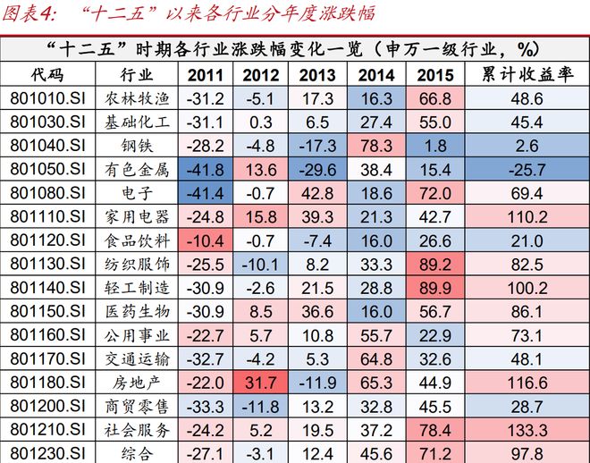 “十二五”时期风格切换(2011至2015年),先价值后成长,产业趋势和货币环境是关键。股市场则经历了一轮完整的大小盘风格与成长价值风格的切换,其行业表现分化之剧、轮动之快,堪称一部生动的市场教科书。这5年清晰地划分为两个主要阶段:2011-2012年的防御与价值主导期,前期政策刺激的阵痛开始显现,国内经济下行压力加大、通胀压力提升,货币政策趋紧导致市场风险偏好显著下降,市场趋于相对避险,银行和非银受益于业绩稳定性和创业板催化,食品饮料、家电表现出韧性,房地产受益于政策放松,这些行业表现较强。2013年至2015年,在移动互联网浪潮的产业趋势、双创与并购重组等政策利好和流动性宽松背景下,城关镇风格表现突出,与智能手机普及、手游、影视、互联网金融等相关的计算机、传媒、电子行业成为最亮眼的“三朵金花”。在这一时期可以清晰看到,一是宏观经济出现波动时,业绩的确定性和安全性是市场关注焦点,二是产业趋势叠加流动性宽松环境,会显著提升行业估值。三是资本市场深化、改革对提升市场风险偏好有积极作用。