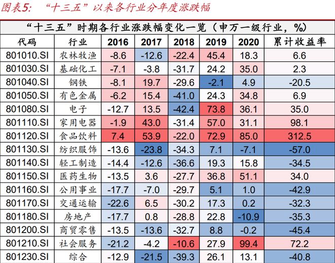 “十三五”时期拥抱趋势(2016年至2020年),国家战略、产业趋势和消费升级是核心驱动。A股经历了一轮牛熊转换和风格切换,市场表现较为分化,2015年中股市出现较大幅度的回撤之后,2016-2017年市场主线呈现为“白马蓝筹价值回归”,2019-2020年则呈现出“科技与消费双轮驱动”,表现较好的行业主要是受到消费升级、产业政策及时代发展趋势的领域,一是顺周期板块受益于供给侧结构性改革显著修复;二是受益于消费升级趋势,食品饮料、家用电器等行业表现较强,特别是白酒板块,受益于消费升级和品牌集中度提升,成为这五年最具代表性的长牛板块。贵州茅台作为龙头,其品牌护城河和提价能力获得了市场极高溢价。三是产业周期驱动行业快速发展,其中以电子、半导体行业和新能源车行业最为典型。这一时期的最大特征是,一方面表现较好的行业均有清晰的长期发展趋势支撑,二是供给侧结构性改革等产业政策及科创板开市等资本市场改革政策的催化至关重要,能够显著推动相关行业的市场表现。