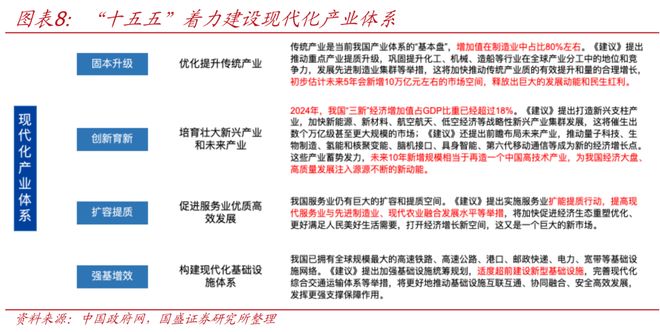 >建设现代化产业体系,巩固壮大实体经济根基。“十五五”建议稿强调“坚持把发展经济的着力点放在实体经济上...构建以先进制造业为骨干的现代化产业体系”。重点在四个方面发力,1)优化提升传统产业,巩固提升矿业、冶金、化工、轻工、纺织、机械、船舶、建筑等产业在全球产业分工中的地位和竞争力。积极推动智能化、绿色化、融合化发展。2)培育壮大新兴产业和未来产业,加快新能源、新材料、航空航天、低空经济等战略性新兴产业集群发展,前瞻布局未来产业,探索多元技术路线、典型应用场景、可行商业模式、市场监管规则,推动量子科技、生物制造、氢能和核聚变能、脑机接口、具身智能、第六代移动通信等成为新的经济增长点。3)促进服务业高效发展,分领域推进生产性服务业向专业化和价值链高端延伸。4)构建现代化基础设施体系。