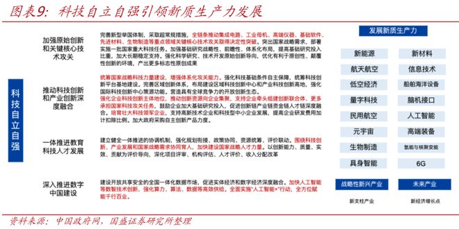 >科技自立自强是引领新质生产力发展。抓住新一轮科技革命和产业变革是重中之重,一方面中国式现代化需要靠科技现代化支撑,另一方面科技创新是中美博弈的战略主战场,抢占科技发展制高点是大国博弈的战略布局。“十五五”规划以“科技自立自强,引领新质生产力发展”,重点在于四方面发力:1)加强原始创新及关键核心技术攻关。完善新型举国体制,采取超常规措施,全链条推动集成电路、工业母机、高端仪器、基础软件、先进材料、生物制造等重点领域关键核心技术攻关取得决定性突破。2)推动科技创新和产业创新深度融合,统筹国家战略科技力量建设,增强体系化攻关能力。3)一体推进教育科技人才发展。加快建设国家战略人才力量,培养造就更多战略科学家、科技领军人才、卓越工程师、大国工匠、高技能人才等各类人才。4)深入推进数字中国建设。全面实施“人工智能+”行动,以人工智能引领科研范式变革,加强人工智能同产业发展、文化建设、民生保障、社会治理相结合,抢占人工智能产业应用制高点,全方位赋能千行百业。