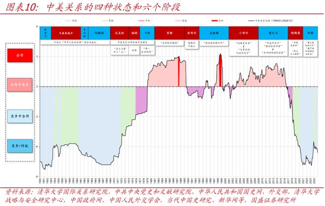 自特朗普2025年上任以来,颁布了一系列重塑全球格局的政策措施,并将中国视为维持美国全球领先地位的最大挑战者,中美关系因而成为市场关注焦点,也成为影响全球宏观和资产配置的关键变量,相比于短期事件跟踪,我们希望引入一个基本框架,帮助大家更好的理解中美关系长期趋势与未来变化。总体上,中美关系可以分为四种状态,1)完全合作、2)合作中竞争、3)竞争中合作、4)脱钩(完全竞争),自1949年新中国成立以来,中美关系经历了若干次变化,均在这个框架内可以予以解释,从20世纪50年代的敌对到20世纪70年代的破冰,到改革开放以来的合作不断强化,再到特朗普就任以来的竞争加剧,当前中美关系总体上维持“竞争中合作”态势,即在半导体、人工智能、军事等部分领域竞争较为激烈,在经贸、金融、农产品等部分领域存在合作。