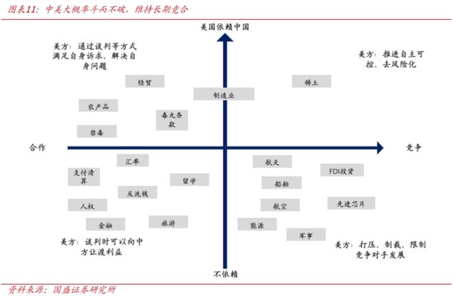3)中美关系的背后,是中美在科技、经贸、军事、制造业、人权、能源、航空、投资、金融、汇率、禁毒、稀土、芯片、农产品、旅游等一系列领域的竞争、合作关系,其中竞争性领域出现摩擦难以避免,谈判交流重在避免摩擦升级、管控分歧、增加互信,合作性领域则是谈判和利益交换的重要“筹码”。