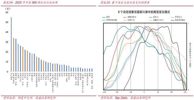 其二,换一个视角来看,达利欧曾在研究1500年以来大国兴衰史时引入8个重要指标来衡量世界主要大国实力变化:教育、产业及产品竞争力、科技创新、经济产出、世界贸易份额、军事实力、金融中心实力。当出现大国之间的实力更替时,教育、科技创新、产业及产品竞争力等层面会率先崛起,随后是军事实力、世界贸易份额、经济产出和金融中心实力,最后是储备货币。