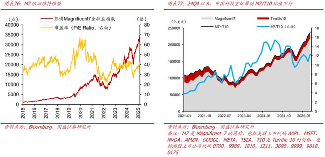 战略层面,以人工智能为代表的科技革命是中美战略博弈的主战场。美国方面,自特朗普胜选以来,AI曼哈顿计划、星际之门、《赢得竞争:人工智能行动计划》等先后颁布,明确将中国作为竞争目标,致力于通过去监管化、国际标准制定、芯片管制、制裁工具等方式帮助美国人工智能发展,并施压竞争对手。中国层面,科技自立自强在“十五五”规划中被摆到更为重要的位置上,力求打造从原始创新、核心技术到产业与创新融合落地的全链条创新机制,以科技自立自强来引领新质生产力发展,解决内外部环境遇到的挑战。以中美科技的代表性公司来看,整体看,代表美国Magnificent 7和代表中国的Terrific 10,合计总市值已经突破23万亿美元。具体看,2022年初ChatGpt横空出世带动美国人工智能行业快速发展, M7显著走强,2025年1月DeepSeek问世意味着中国人工智能行业迎来拐点,随后T10市值大幅提升,预计未来中美代表性公司市值有望进一步提升,其中中国T10的整体规模相对较小,成长性更强,M7/T10有望逐步收敛。
